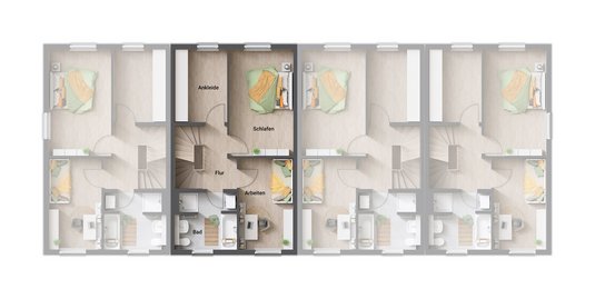 Das Reihenhaus Mainz 128 bietet Ihnen die ideale Kombination aus modernem Wohnen und effizienter Flächennutzung. Mit vier Wohneinheiten entsteht ein attraktives Zuhause, das zugleich Raum für Individualität und Gemeinschaft schafft. Jede Einheit verfügt über rund 140 Quadratmeter Wohnfläche, verteilt auf drei Etagen mit einem großzügigen Wohn- und Essbereich im Erdgeschoss, komfortablen Schlaf- und Kinderzimmern im Obergeschoss sowie einem vielseitig nutzbaren Studio im Dachgeschoss.